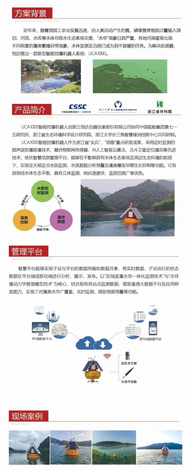 UCA1000智能控藻機(jī)器人由浙江恒達(dá)儀器儀表股份有限公司協(xié)同中國(guó)船舶集團(tuán)第七一 五研究所、浙江省生態(tài)環(huán)境科學(xué)設(shè)計(jì)研究院、浙江大學(xué)長(zhǎng)三角智慧綠洲創(chuàng)新中心共同研制。 UCA1000智能控藻機(jī)器人作為浙江省“尖兵”、“領(lǐng)雁”重點(diǎn)研發(fā)成果,采用定時(shí)監(jiān) 測(cè)的超聲波抑藻除藻技術(shù),融合物聯(lián)網(wǎng)傳感器、AI人工智能云算法、北斗衛(wèi)星定位通訊等 先進(jìn)技術(shù),依托智慧信息管理平臺(tái),能夠在不影響原有水體生態(tài)系統(tǒng)及周邊生態(tài)環(huán)境的前 提下,實(shí)現(xiàn)全天候定點(diǎn)水質(zhì)監(jiān)測(cè)、水質(zhì)數(shù)據(jù)分析預(yù)警及藻類(lèi)爆發(fā)早期生長(zhǎng)抑制等功能???有效保持水體生態(tài)平衡,具有立體監(jiān)測(cè)、響應(yīng)速度快、監(jiān)測(cè)范圍廣等優(yōu)勢(shì)。 |