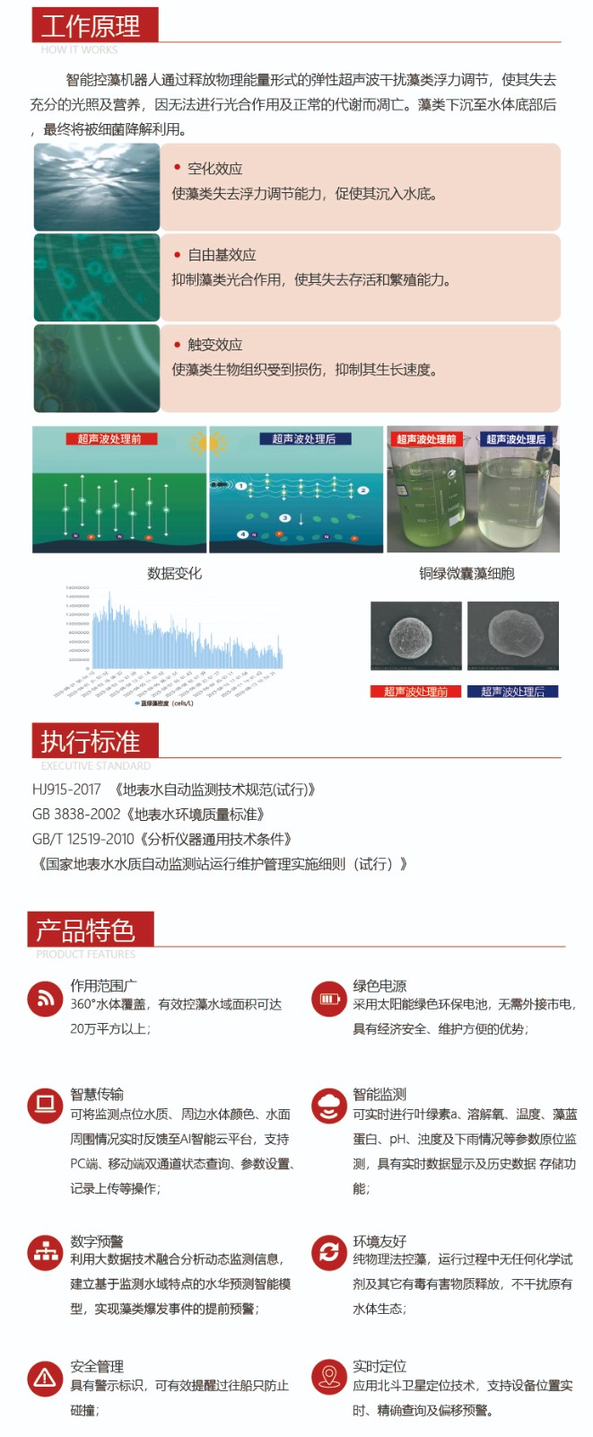 UCA1000智能控藻機(jī)器人由浙江恒達(dá)儀器儀表股份有限公司協(xié)同中國(guó)船舶集團(tuán)第七一 五研究所、浙江省生態(tài)環(huán)境科學(xué)設(shè)計(jì)研究院、浙江大學(xué)長(zhǎng)三角智慧綠洲創(chuàng)新中心共同研制。 UCA1000智能控藻機(jī)器人作為浙江省“尖兵”、“領(lǐng)雁”重點(diǎn)研發(fā)成果,采用定時(shí)監(jiān) 測(cè)的超聲波抑藻除藻技術(shù),融合物聯(lián)網(wǎng)傳感器、AI人工智能云算法、北斗衛(wèi)星定位通訊等 先進(jìn)技術(shù),依托智慧信息管理平臺(tái),能夠在不影響原有水體生態(tài)系統(tǒng)及周邊生態(tài)環(huán)境的前 提下,實(shí)現(xiàn)全天候定點(diǎn)水質(zhì)監(jiān)測(cè)、水質(zhì)數(shù)據(jù)分析預(yù)警及藻類(lèi)爆發(fā)早期生長(zhǎng)抑制等功能???有效保持水體生態(tài)平衡,具有立體監(jiān)測(cè)、響應(yīng)速度快、監(jiān)測(cè)范圍廣等優(yōu)勢(shì)。 |