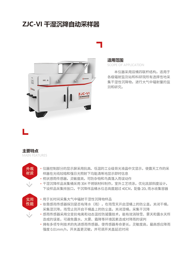 本儀器采用雙桶四聯(lián)桿結(jié)構(gòu),適用于各級輻射監(jiān)測站和科研院所有選擇性地采集干濕性沉降物,進(jìn)行大氣中輻射量的監(jiān)測和研究。